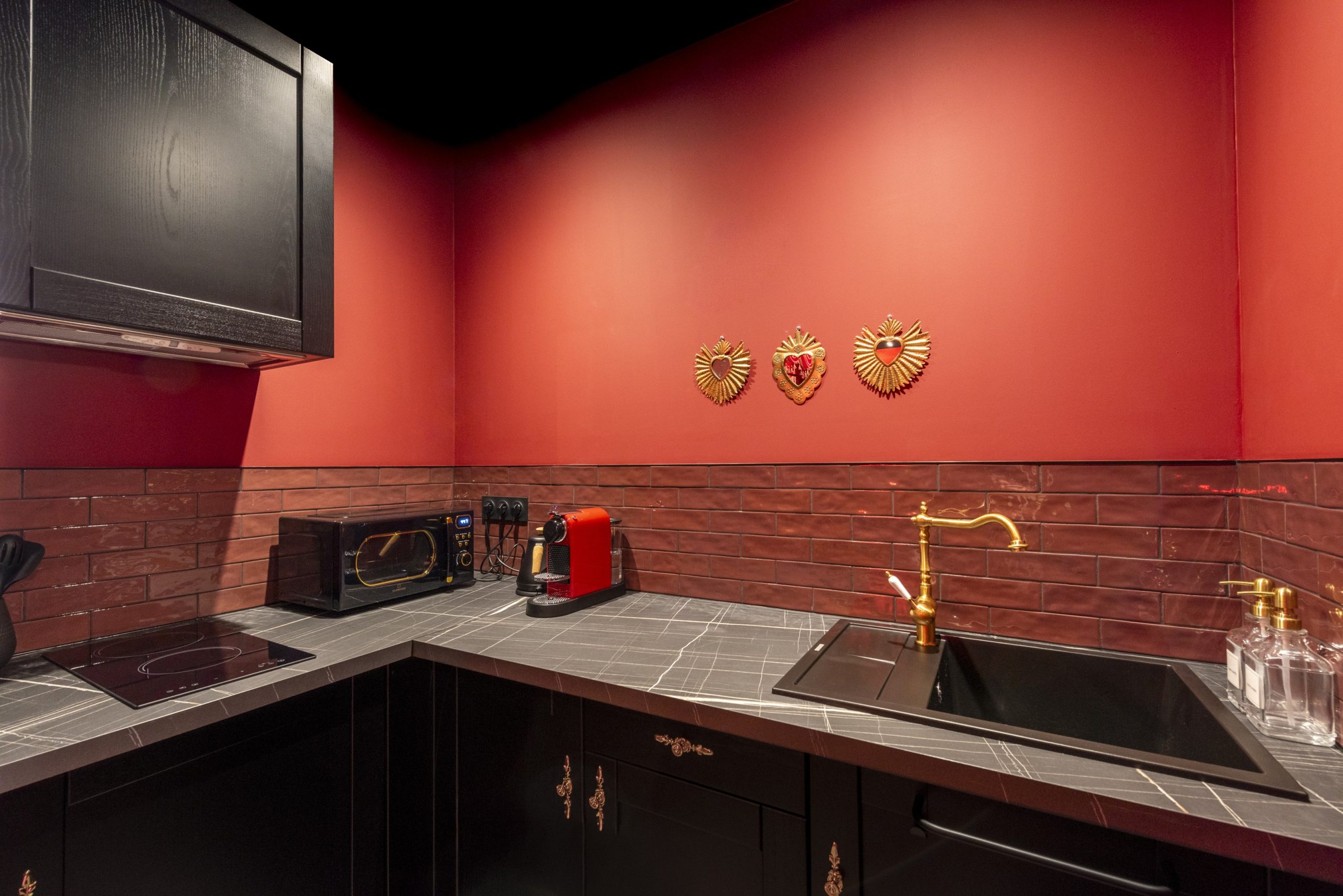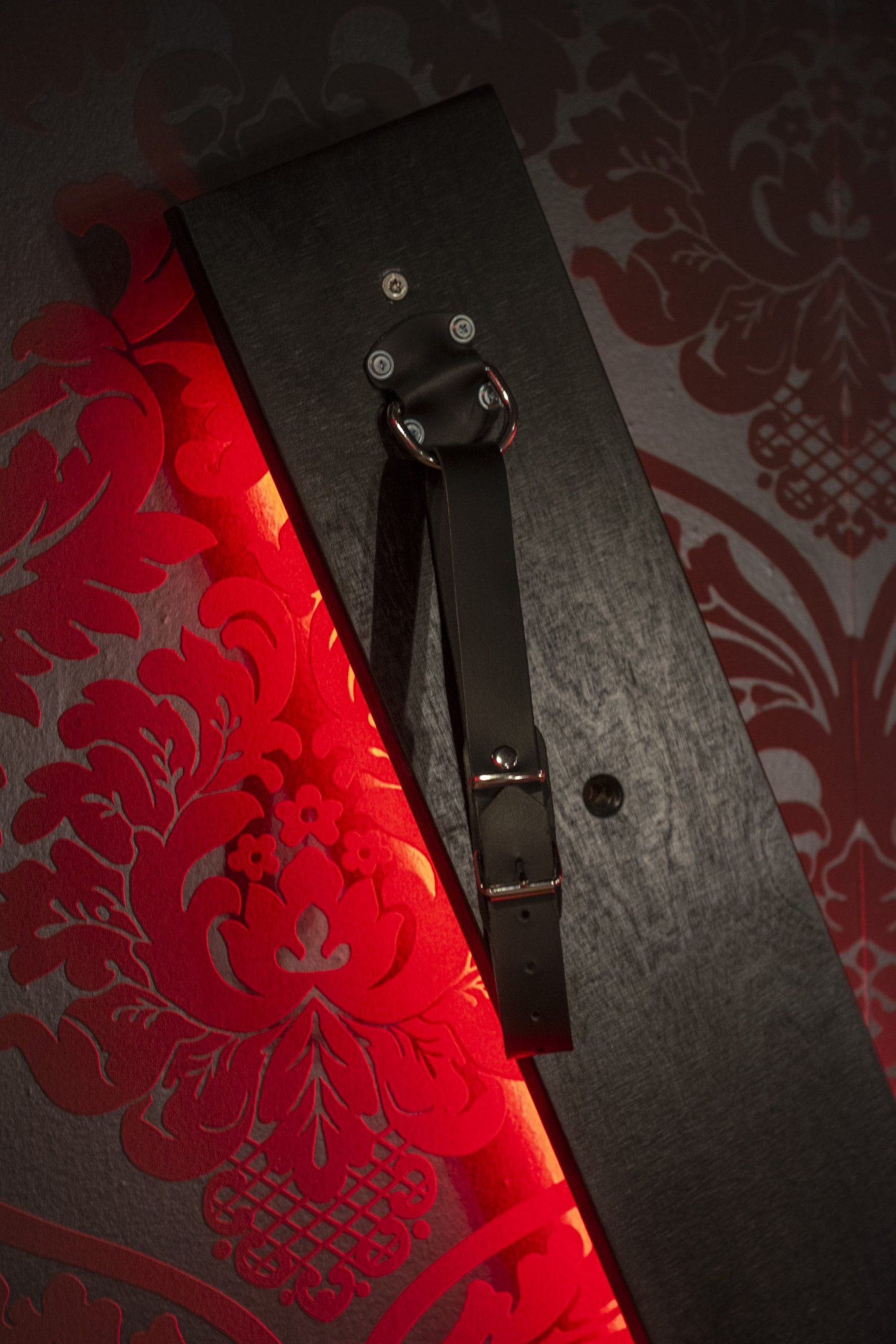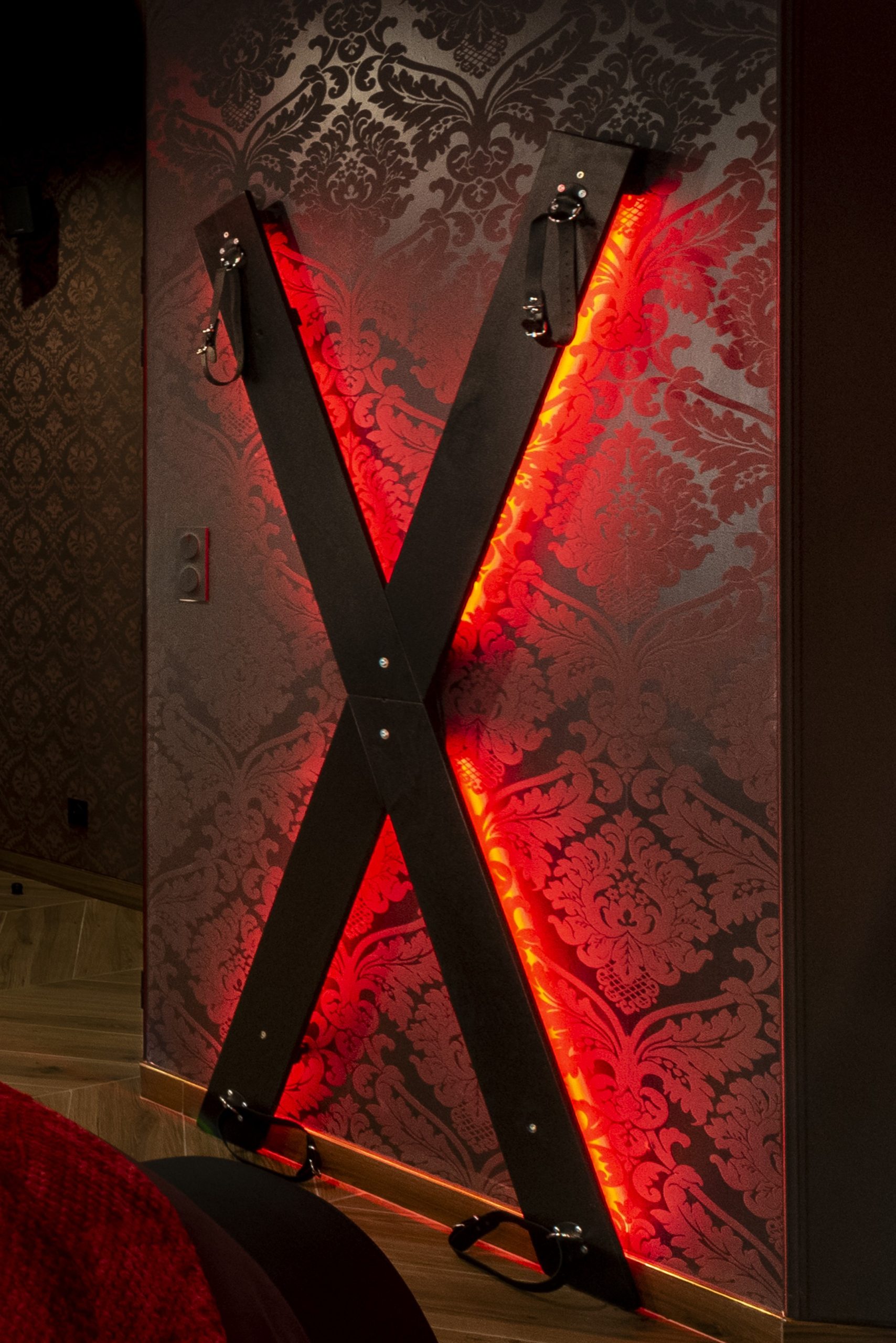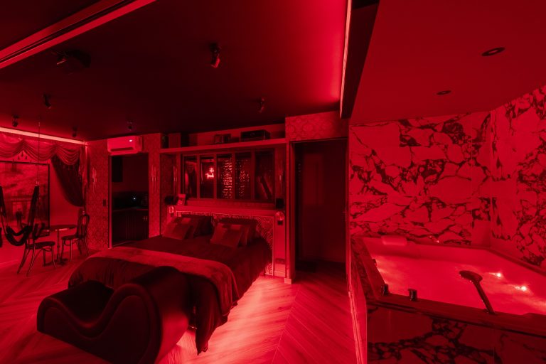 en éteignant toutes les lumières pour ne garder que l’éclairage LED rouge, dans une ambiance très chaude.